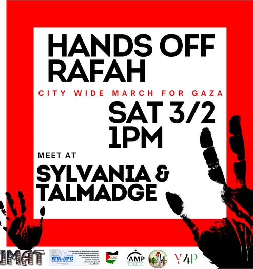 Subject: [EXTERNAL] [peacelist] NWOPC URGENT ANNOUNCEMENT! SATURDAY PROTEST 3/2 at 1PM SYLVANIA AVE & TALMADGE RD -> "HANDS OFF RAFAH - CITY WIDE MARCH FOR GAZA!" see flyer
