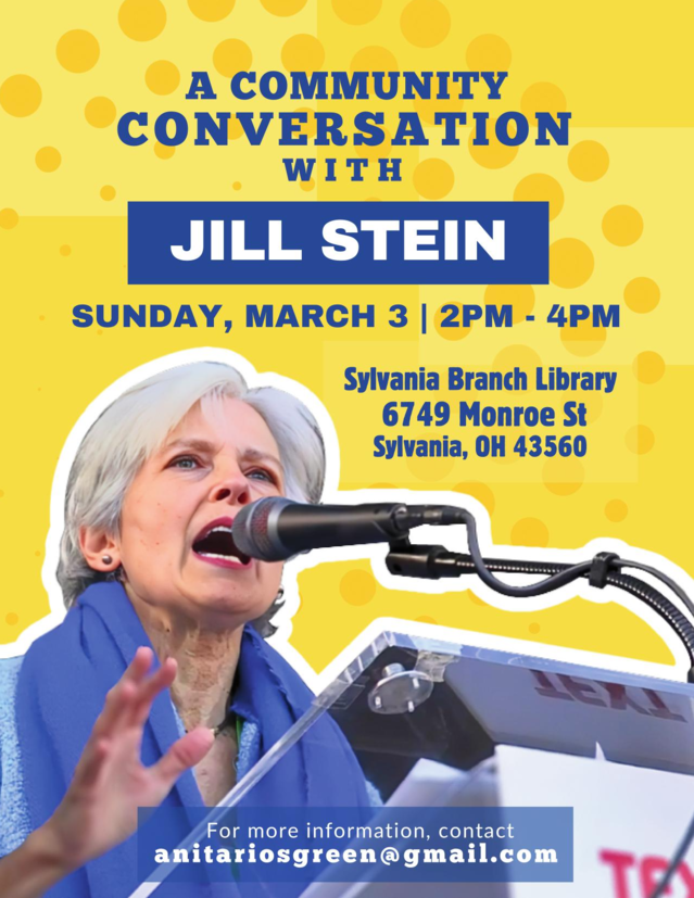 ANNOUNCEMENT& PUBLIC INVITATION! To "A Community Conversation With JILL STEIN 2024 in TOLEDO on SUNDAY 3/7 2:00pm-4:00pm at Sylvania Branch Library!
