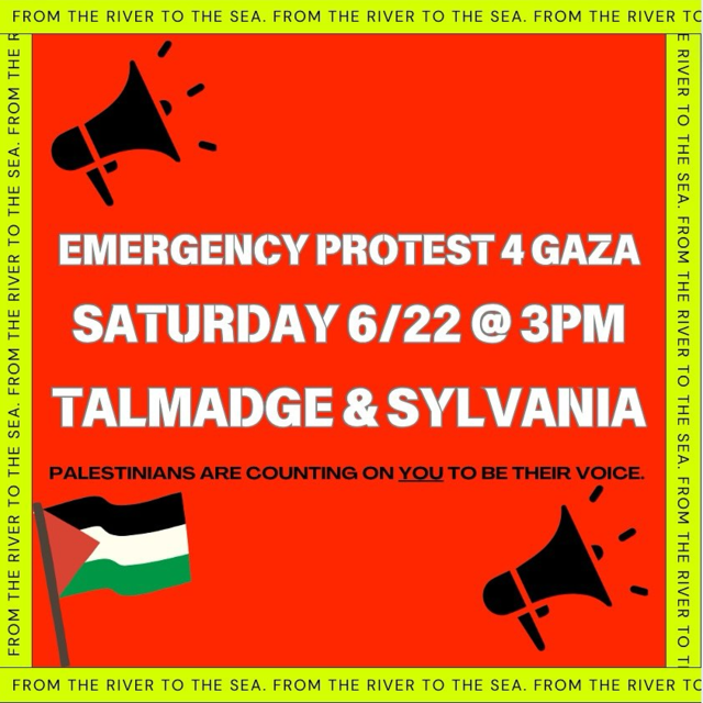 NWOPC ALERT! EMERGENCY PROTEST 4 GAZA! Saturday 6/22 @ 3pm - TALMADGE & SYLVANIA - WE MUST BE THE VOICE FOR PALESTINE! see flyer