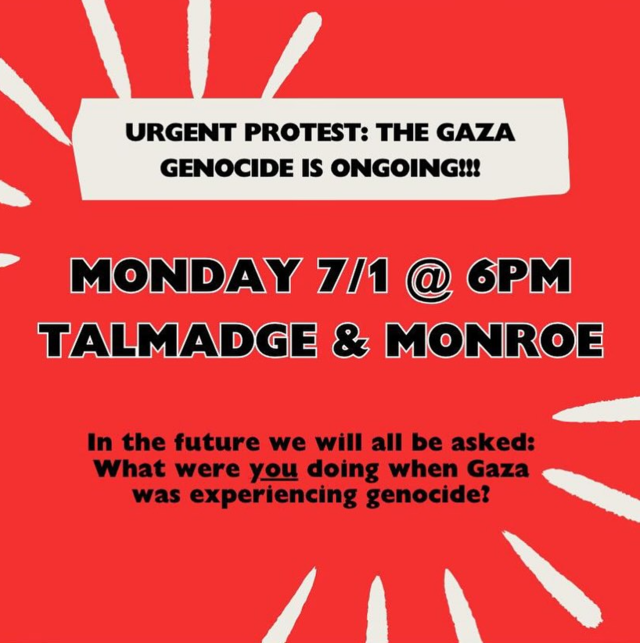 NWOPC ALERT! URGENT PROTEST FOR GAZA! TODAY- Monday 7/1/24 @ 6PM - TALMADGE & MONROE STS. - see flyer -> END THE GENOCIDE NOW!!!