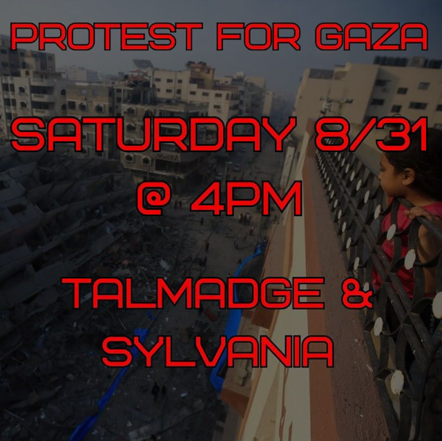 NWOPC ALERT! PROTEST FOR GAZA! SATURDAY 8/31 @ 4pm - TALMADGE & SYLVANIA - see flyer
