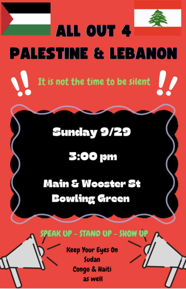 NWOPC ALERT: ! All Out 4 Palestine & Lebanon ! - Bowling Green, OH - Sunday, 9/29/24 @3pm - Main & Wooster Sts. - see flyer