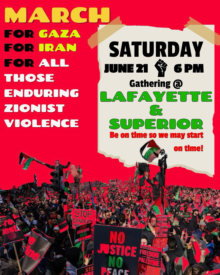 NWOPC Reminder! AMP -Toledo /NWOPC -> MARCH FOR GAZA, IRAN, AND ALL ENDURING ZIONIST VIOLENCE - Saturday June 21 @ 6:00pm - Lafayette & Superior Sts. - see flyer