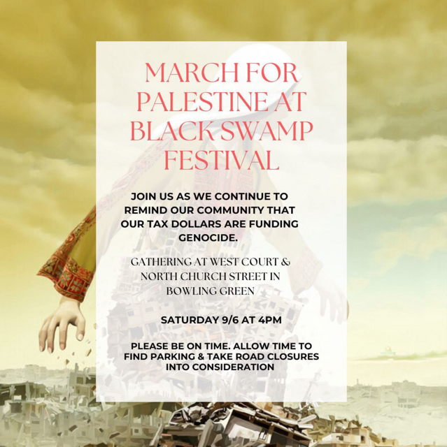 March For Palestine At Black Swamp Festival - Sat 9-6-25 @4pm - Meet West Court & North Church to Begin March - see flyer