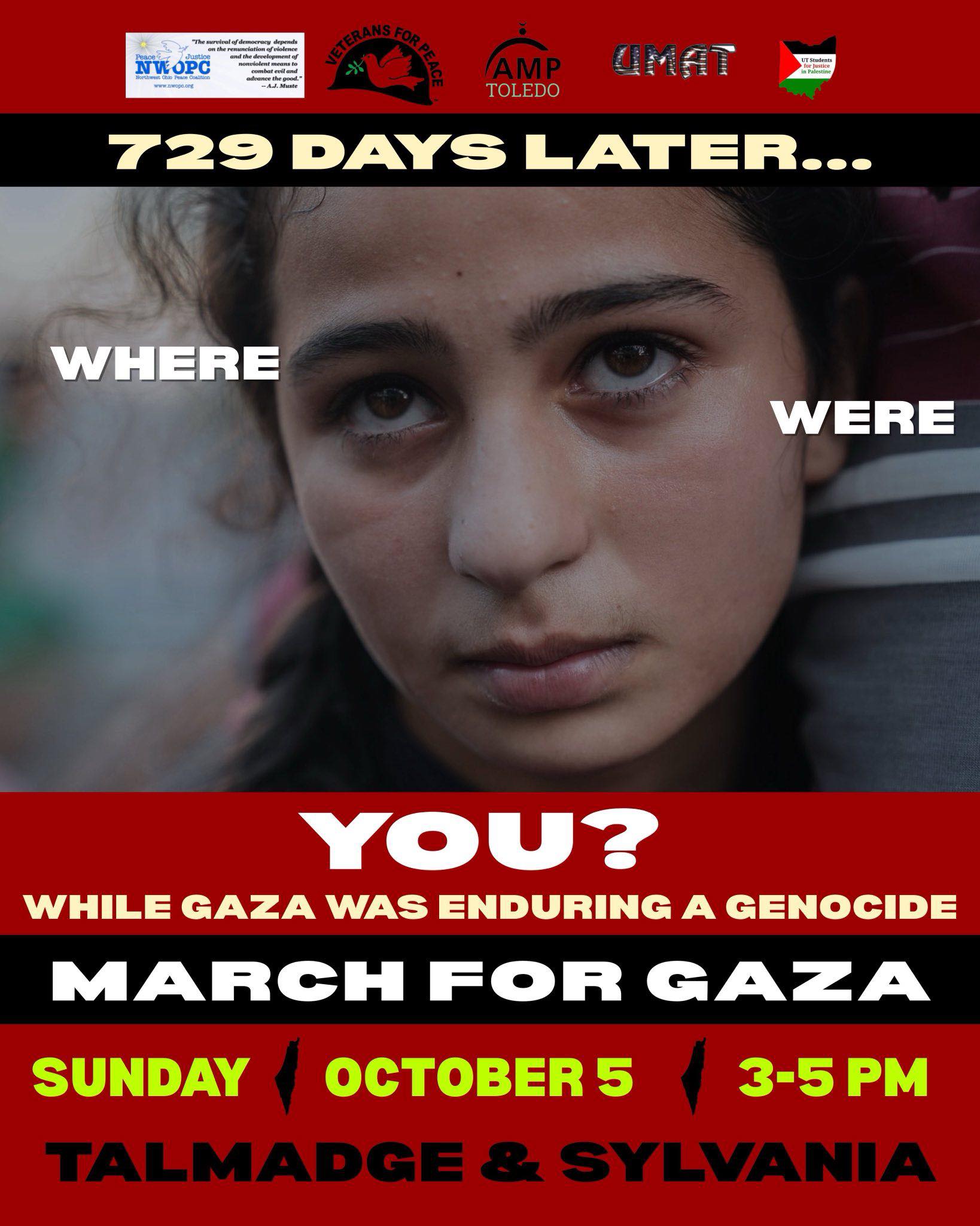 March for Gaza: 729 Days of Genocide -> Where were you?! Sunday Oct 5th 3pm-5pm Talmadge & Sylvania - see flyer attached - circulate widely
