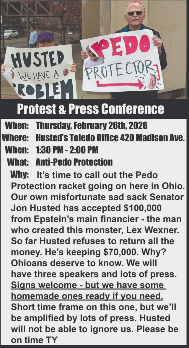 URGENT! Protest & Press Conference TODAY 2-26-26! 1:30pm-2:00pm @ Sen Husted's Office, 420 Madison, TOLEDO - see flyer
