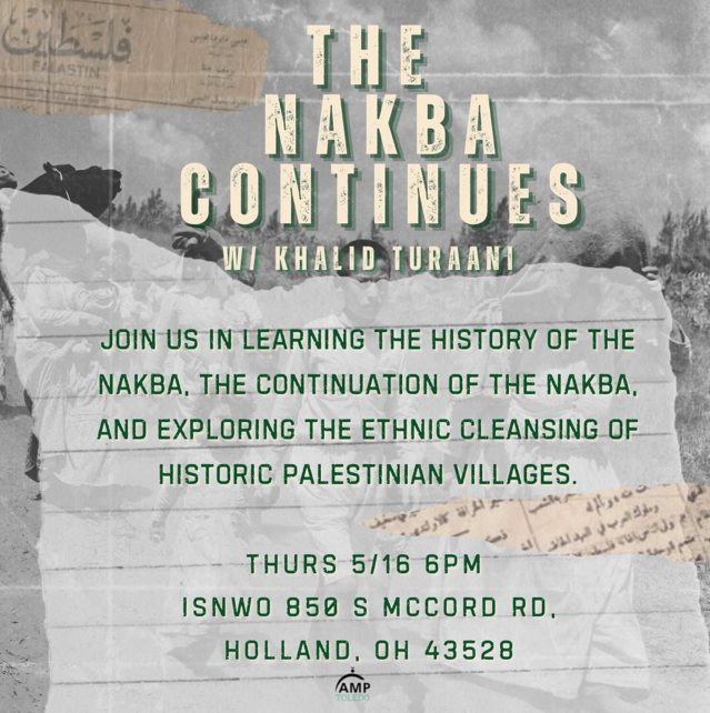 NWOPC ALERT! THE NAKBA CONTINUES w/KHALID TURAANI (special quest)- THURS 5/16/24 @ 6pm ISNWO, 850 S. McCord Rd, Holland, OH - see flyer