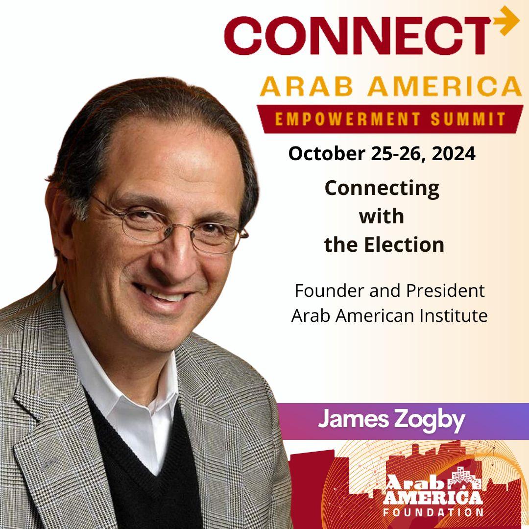 The Arab America Foundation is excited to announce Dr. James Zogby as a speaker at the CONNECT Arab America: Empowerment Summit, which will be held on Friday, October 25, and Saturday, October 26, 2024, at the Dearborn Community and Performing Arts Center, 15801 Michigan Avenue, Dearborn, Michigan 48126.