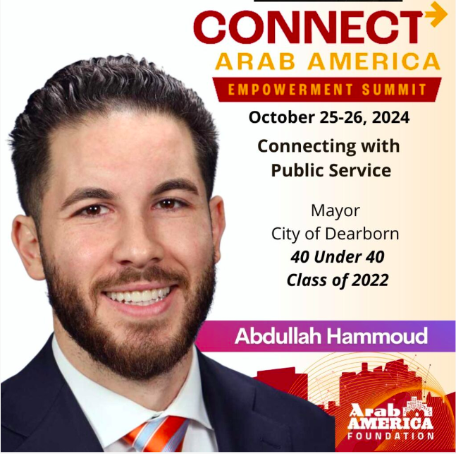 The Arab America Foundation is excited to announce that Dearborn Mayor Abdullah Hammoud will speak at the CONNECT Arab America: Empowerment Summit, which will be held on Friday, October 25, and Saturday, October 26, 2024, at the Dearborn Community and Performing Arts Center, 15801 Michigan Avenue, Dearborn, Michigan 48126--October 27 is optional. See program below